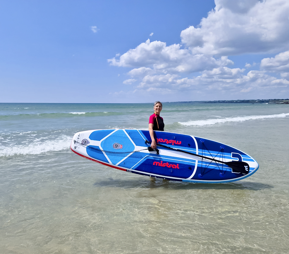 Femme sur une planche de paddle à la plage